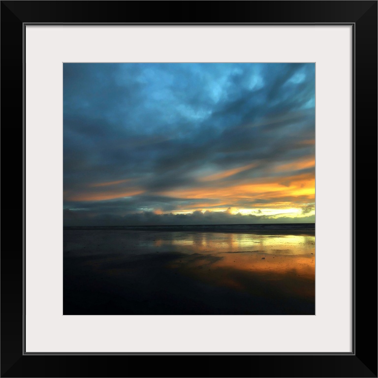 <p>Sunrise with orange and blue colors on a sand beach in France, square view.</p>