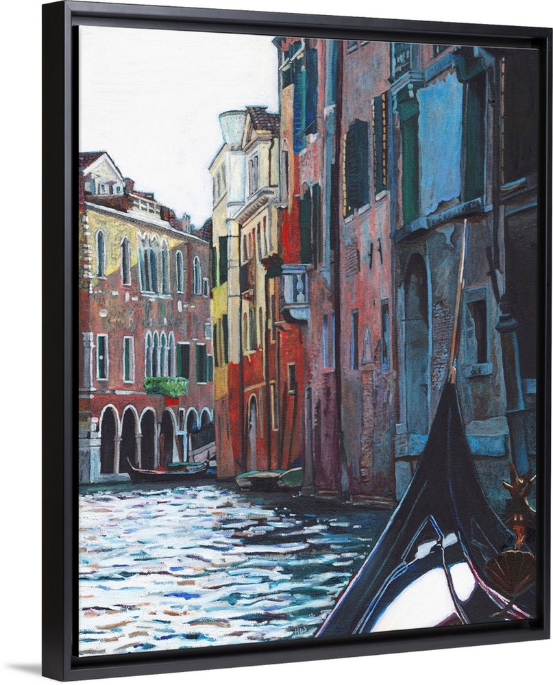 <p>Contemporary painting of a view of Venice from the seat of a gondola.</p>