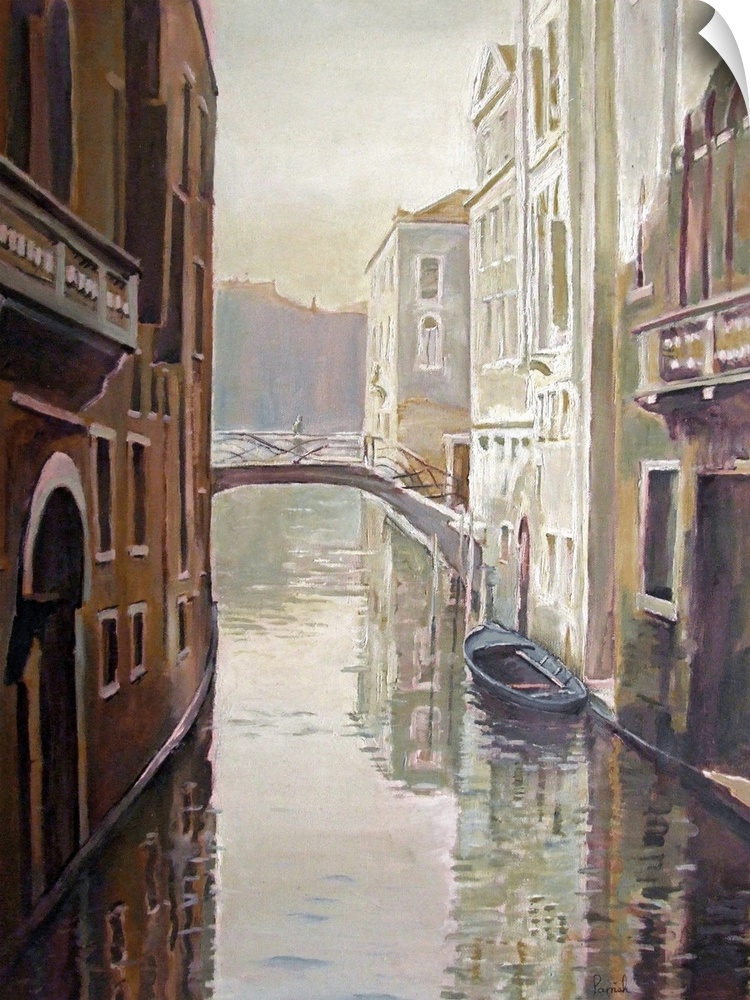 <p>This decorative wall art is a contemporary vertical painting of a canal and the historic buildings that line it.</p>