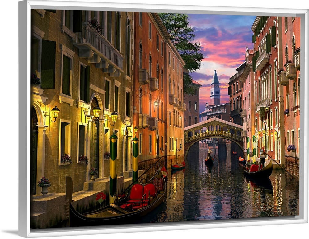 <p>A photograph of a quiet, historic canal filled with gondolas maneuvering in the twilight on this oversized wall art picture.</p>