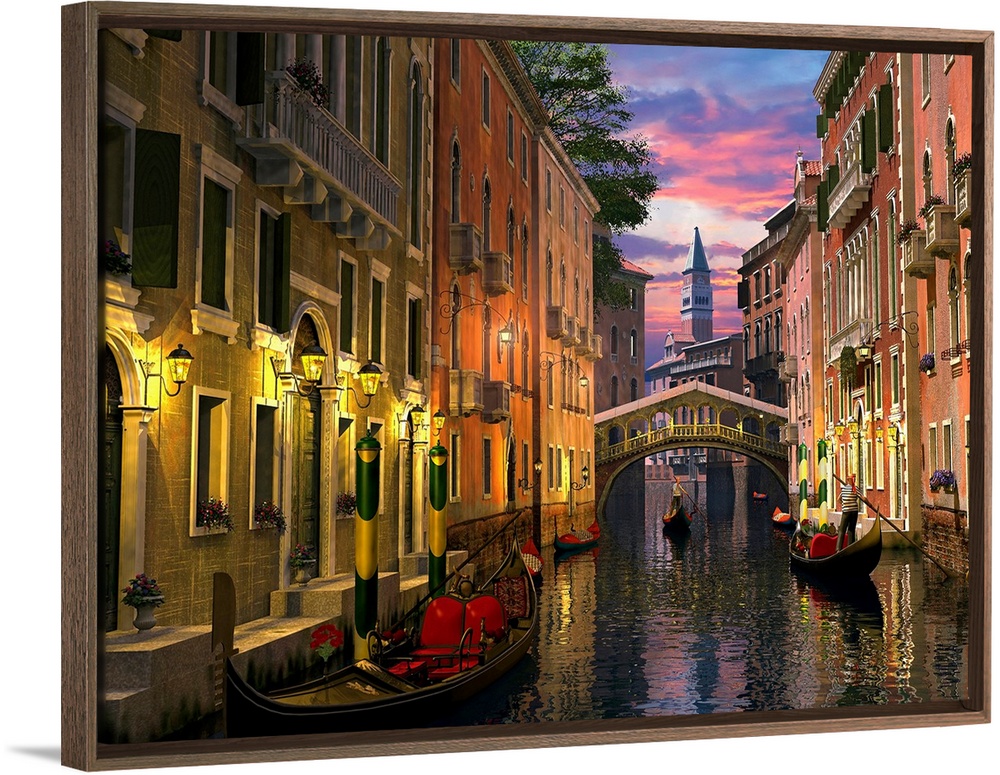 <p>A photograph of a quiet, historic canal filled with gondolas maneuvering in the twilight on this oversized wall art picture.</p>