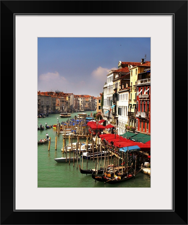 <p>View of the Canale Grande and the gondolas from the top of the Rialto Bridge. Also you can see restaurant and hotels in the riverside and the vaporetto (waterbus) in the background of the shot.Venice is famous for its Carnavale too wich is celebrated in february every year.</p>