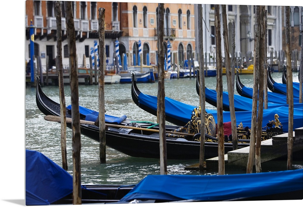 <p>Photograph taken of a river in Venice that is lined with gondola boats that are tied up and have been covered with blue cloth to protect them from the weather elements.</p>