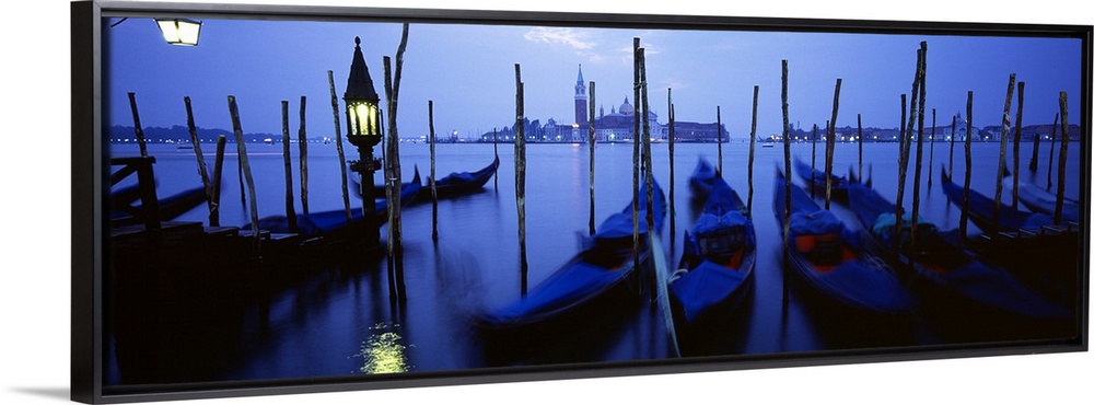 <p>Line of gondolas moored against posts in the evening lit only by a single lamp and moonlight.</p>