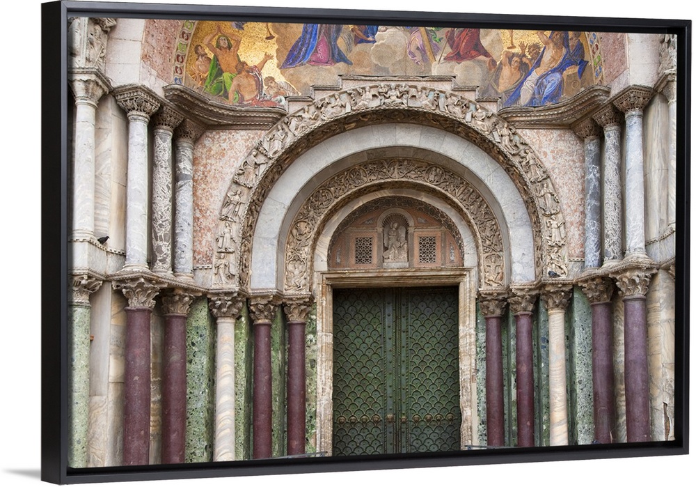 <p>Venice, Veneto, Italy - Carvings and columns line the entrance to an arched church door. Horizontal shot.</p>