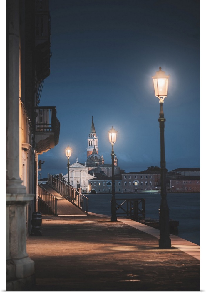 <p>Venice, Veneto, Italy. Riverside alley in Dorsoduro and San Giorgio church in the background at dusk.</p>