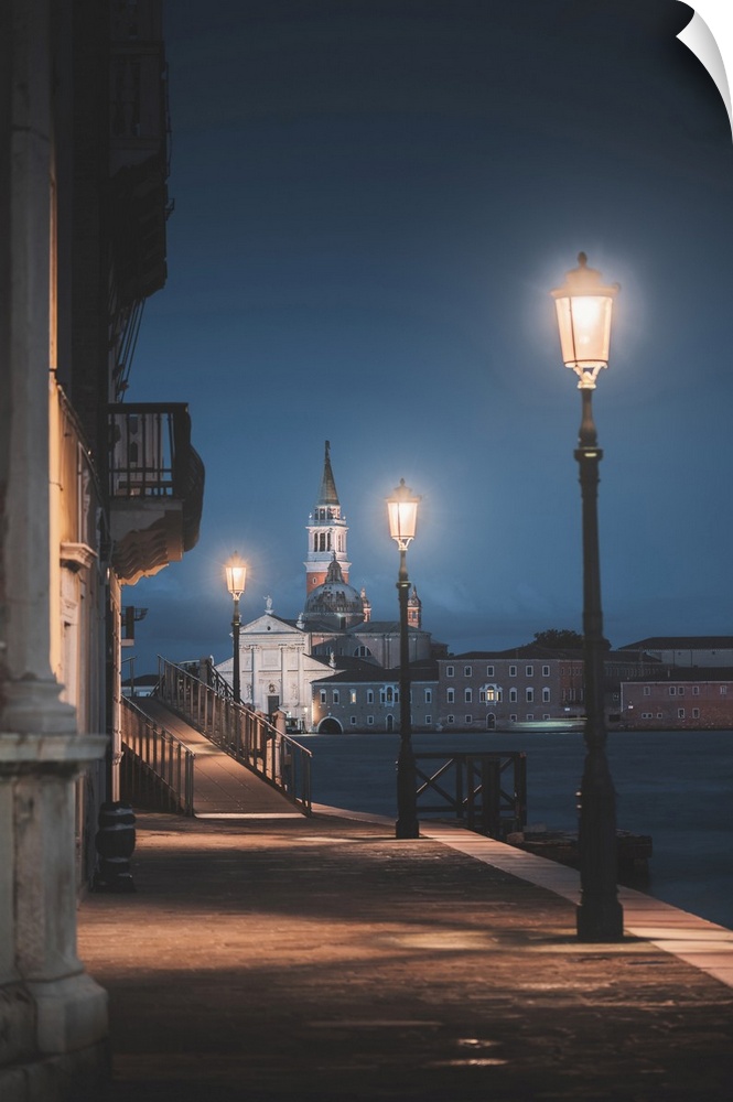 <p>Venice, Veneto, Italy. Riverside alley in Dorsoduro and San Giorgio church in the background at dusk.</p>