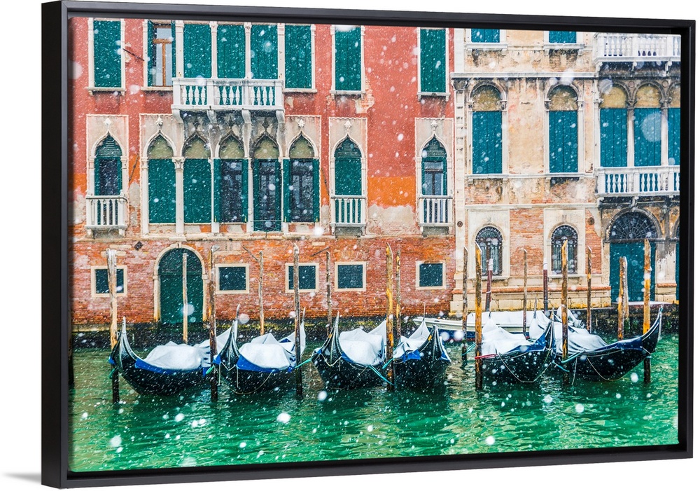 <p>Venice, Veneto, Italy. Snowfall Over Moored Gondolas Along The Grand Canal (Canal Grande).</p>