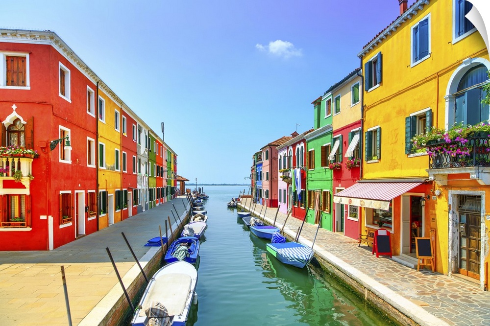 <p>Venice landmark, Burano island canal, colorful houses and boats, Italy. Long exposure photography.</p>