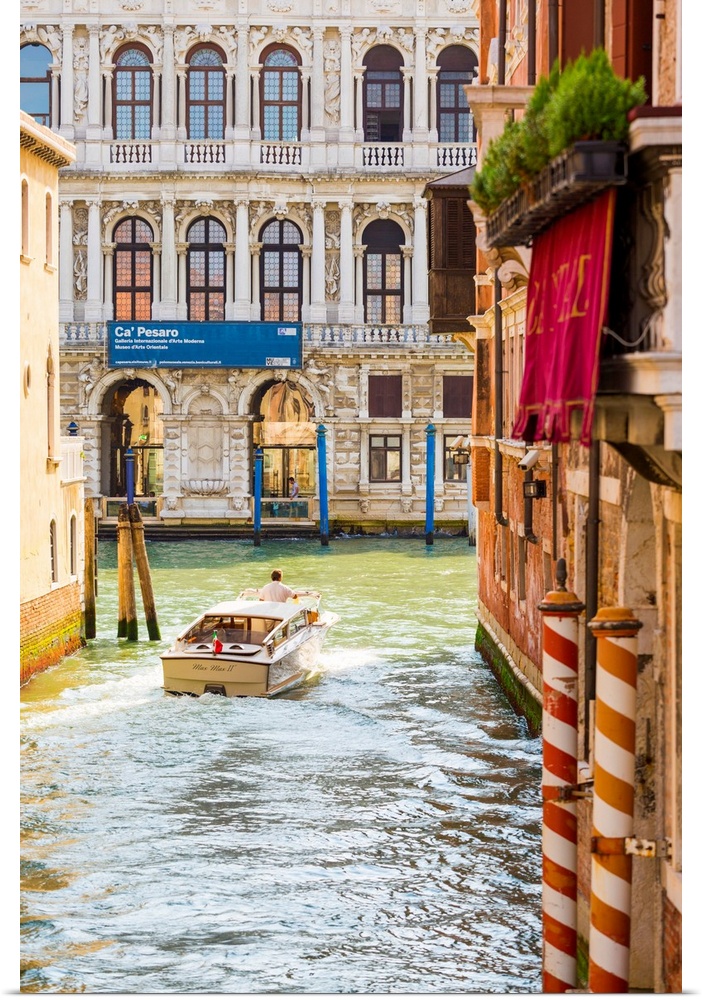 <p>Venice, Veneto, Italy. Buildings and boats in the canals. Ca' Pesaro Palace.</p>