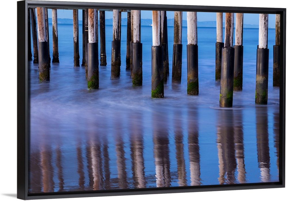 <p>Photograph of the bottom of Ventura Pier pilings reflecting into the ocean water with mountains in the background.</p>