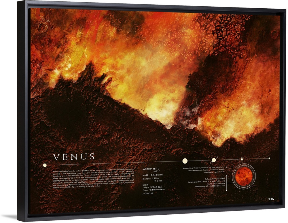 <p>Educational graphic poster of Venus with written facts at the bottom including average temperature, mass, diameter, orbit, and a diagram. Write up reads: "Before anyone had seen the surface of Venus, ancient astronomers named the planet after the dangerous goddess of love and beauty. Now that we?ve seen the planet up close, the name still fits. It?s hard to imagine a planet more beautiful than Venus, with its thick clouds, a sky that ripples with lightning, and active volcanoes that cover more than three-quarters of the surface. Yet like the jealous goddess, the second planet from the sun demands respect. Those thick clouds, made of sulfuric acid, would burn your skin, and the atmosphere itself would poison you and crush you, as it has quickly crushed the spacecraft that began to land there in 1970. And if that isn?t dangerous enough, the planet?s surface temperature reaches about 900&#730;F?the hottest of any in the solar system."</p>