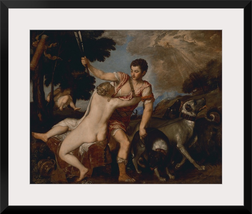 <p>Venus and Adonis, by Titian, c. 1555, Italian Renaissance painting, oil on canvas. The goddess Venus tries to restrain her lover Adonis from going to a hunt. Scene is based on ancient Roman poet Ovid's 'Metamorphoses', in which the mortal Adonis is fatall (BSLOC_2016_6_1)</p>