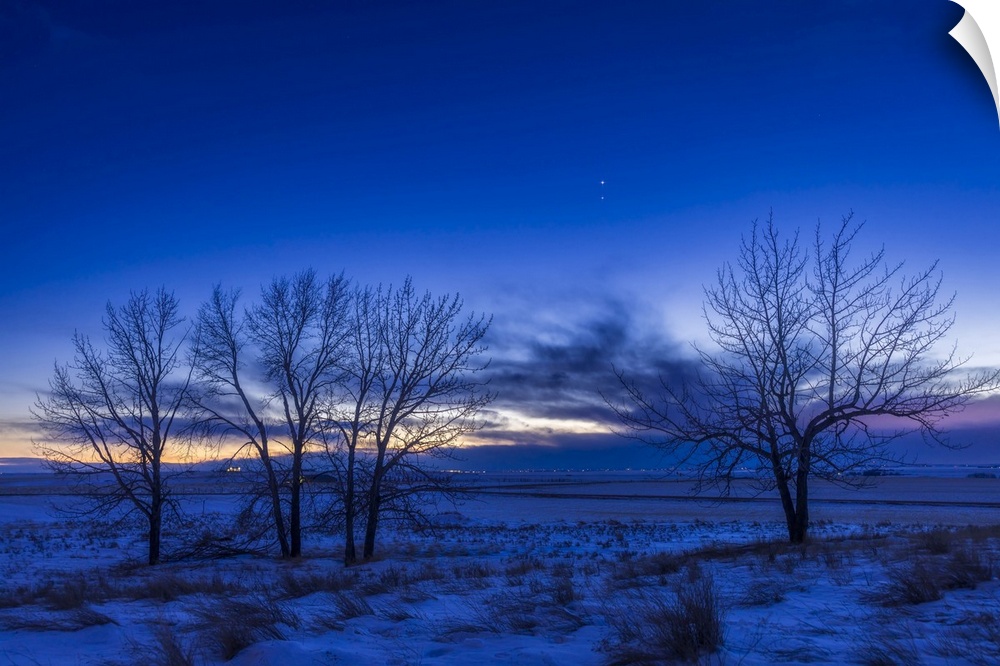 <p>Venus (at top) and Jupiter in a close conjunction, framed between some lone trees, Alberta, Canada</p>