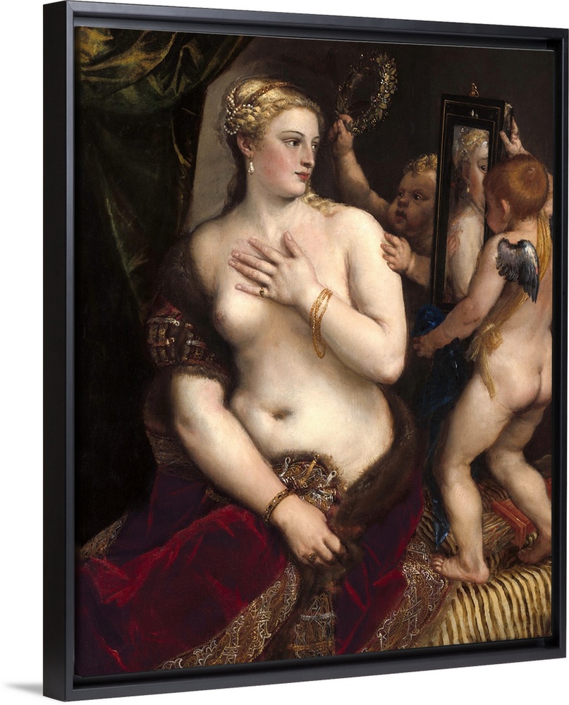 <p>Venus with a Mirror, by Titian, c. 1555, Italian Renaissance painting, oil on canvas. The painting of the classical Goddess of Love was based on a Roman statue of Venus. She looks in a mirror as a cupid reaches to adorn her with the crown of love</p>