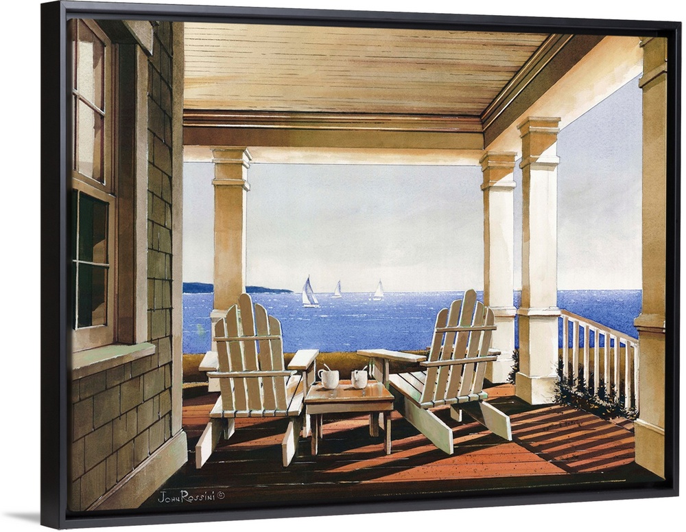 <p>Art print of adirondack chairs on a covered porch overlooking the ocean in afternoon light.</p>