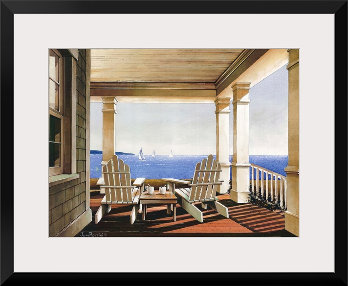 <p>Art print of adirondack chairs on a covered porch overlooking the ocean in afternoon light.</p>