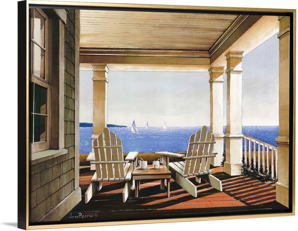 <p>Art print of adirondack chairs on a covered porch overlooking the ocean in afternoon light.</p>