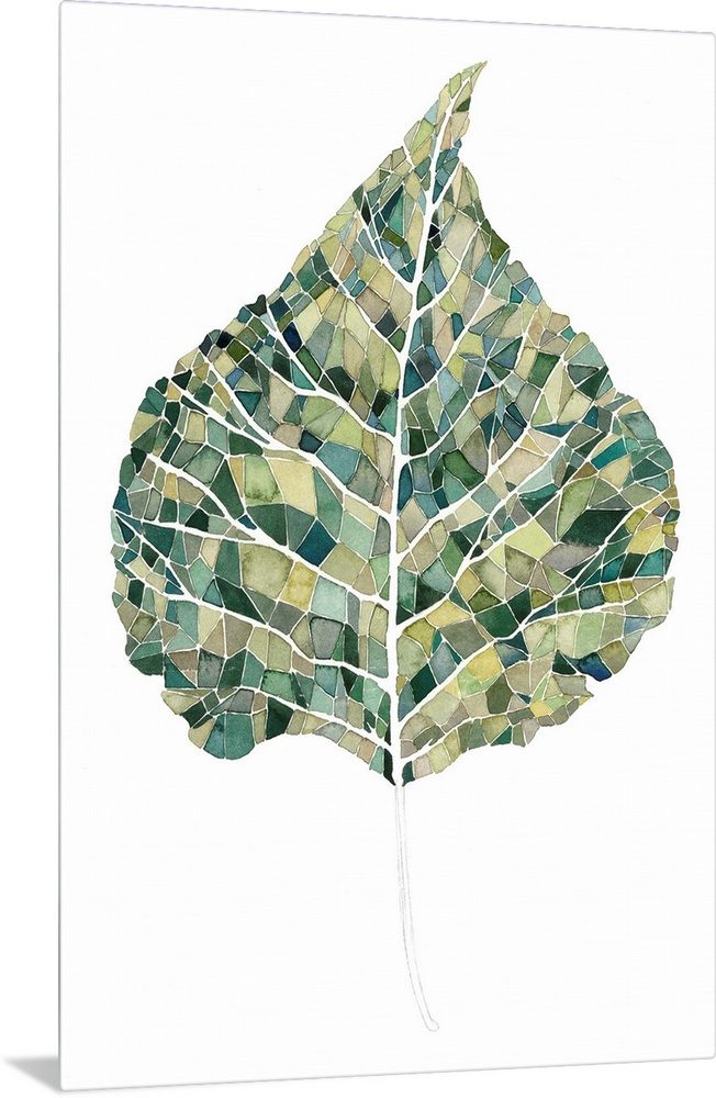 <p>A green leaf with colorful sections resembling stained glass.</p>