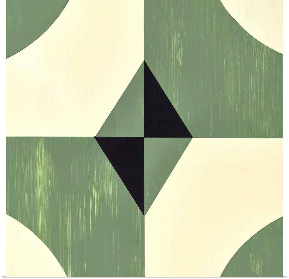 <p>Square symmetric abstract painting using geometric shapes in shades of green, black, and cream.</p>