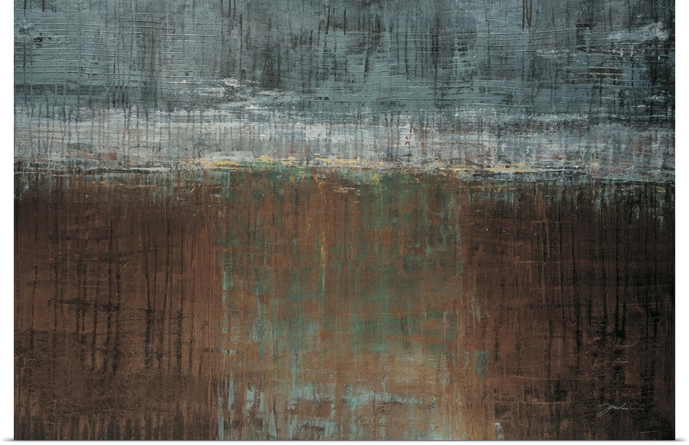 <p>A contemporary abstract painting using muted gray blue tones against a layer of brown tones meeting in the middle of the image.</p>