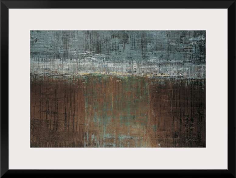 <p>A contemporary abstract painting using muted gray blue tones against a layer of brown tones meeting in the middle of the image.</p>