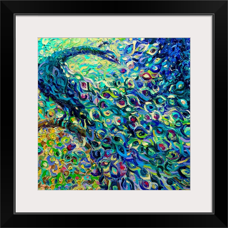 <p>Brightly colored contemporary artwork of an abstract peacock.</p>