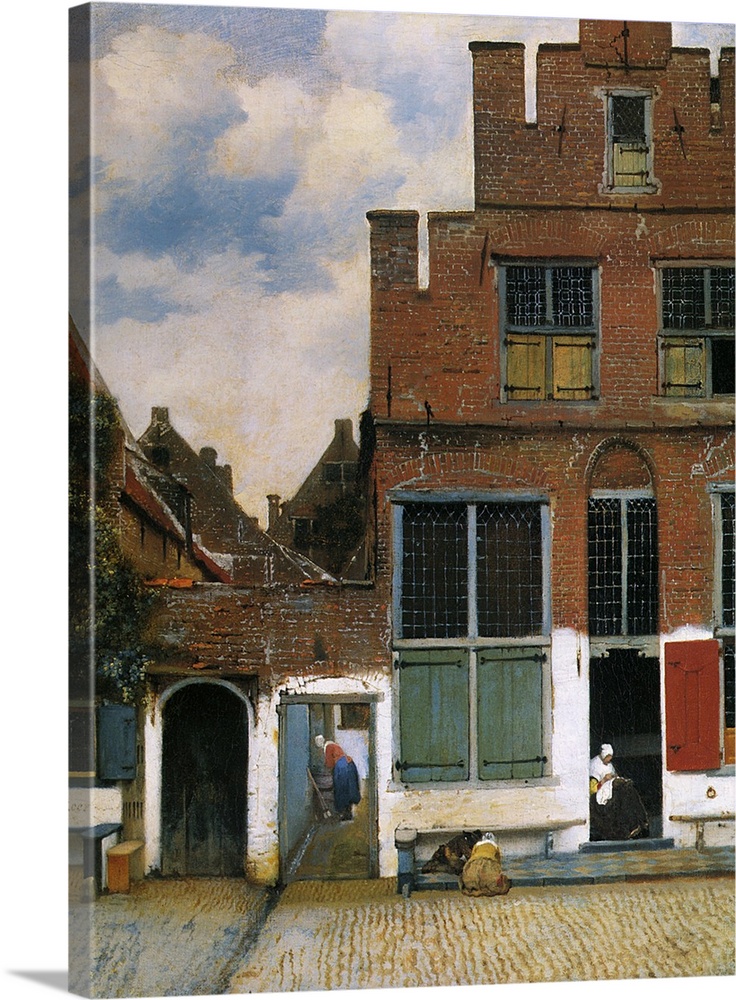 <p>'The Little Street', oil on canvas painting c. 1657-8 by the Dutch artist Johannes Vermeer (Jan Vermeer van Delft, 1632-1675). It is considered a masterpiece of the Dutch realist genre painting of the mid-17th-century Delft School. This is known for images of street scenes, courtyards, squares, households and domestic life. Several possible locations of this realistic quiet street in Delft have been made, but it has been suggested that it may be an allegorical representation compiled from various elements and places. This is similar to the courtyard scenes with open doorways painted by another artist Pieter de Hooch (1629-1684), a contemporary of Vermeer in the Delft guild of St. Luke.</p>