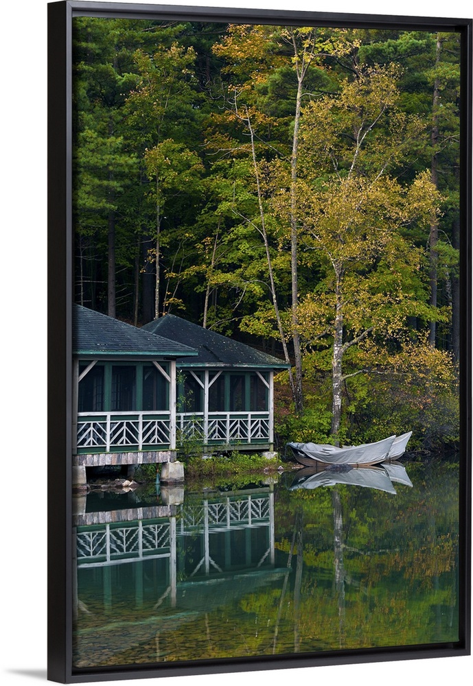 <p>Early morning scene of a beautiful and colorful lakeside boathouse with ornate white railings surrounded by green and gold trees all clearly reflected in the still water below.</p>