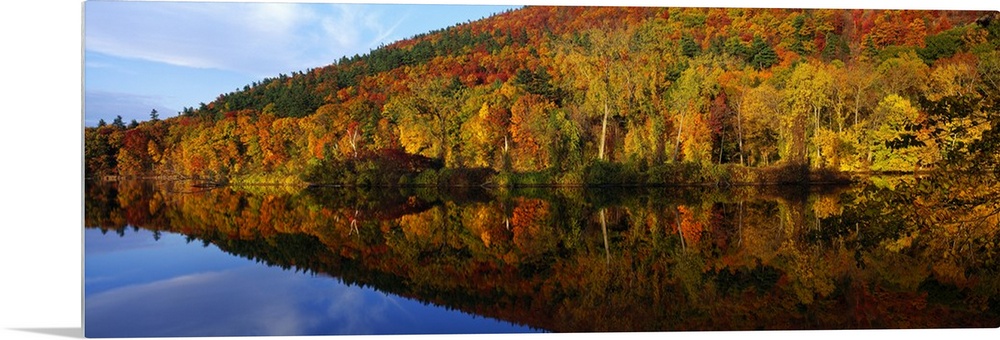 <p>Panoramic photograph of river lined with autumn forest under a cloudy sky. The tree line is reflected in the water below.</p>