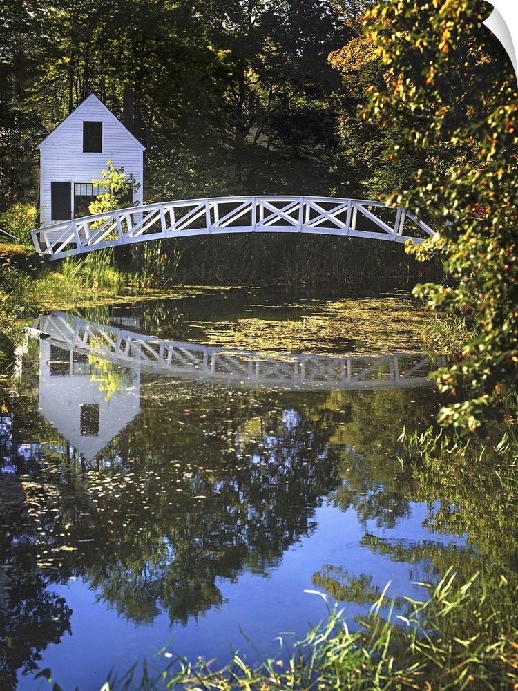 <p>A white timber foot bridge over a pond with reflections of trees and a white building</p>