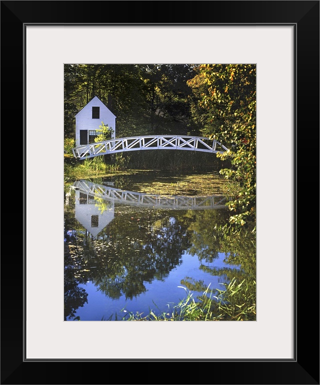 <p>A white timber foot bridge over a pond with reflections of trees and a white building</p>