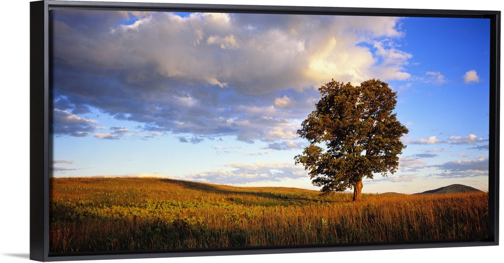 <p>Horizontal photograph on a large wall hanging of a large, lone sugar maple basking in the sunlight in a vast field, beneath a sky with billowing clouds, in Peacham, Vermont.</p>