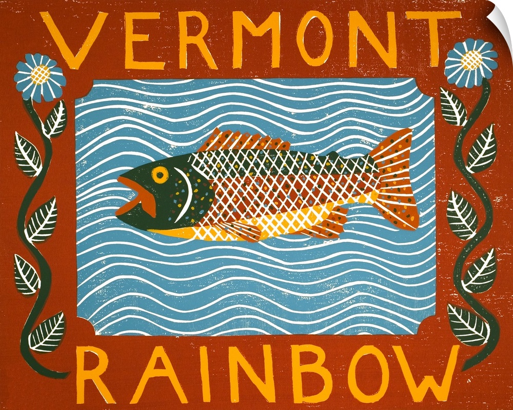 <p>Illustration of a rainbow trout in the water framed with a floral frame with the words "Vermont Rainbow" written on it.</p>