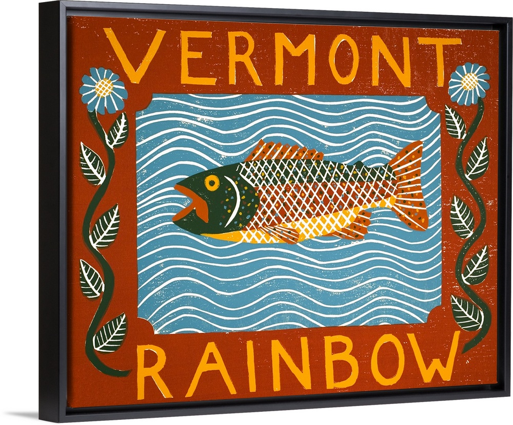 <p>Illustration of a rainbow trout in the water framed with a floral frame with the words "Vermont Rainbow" written on it.</p>