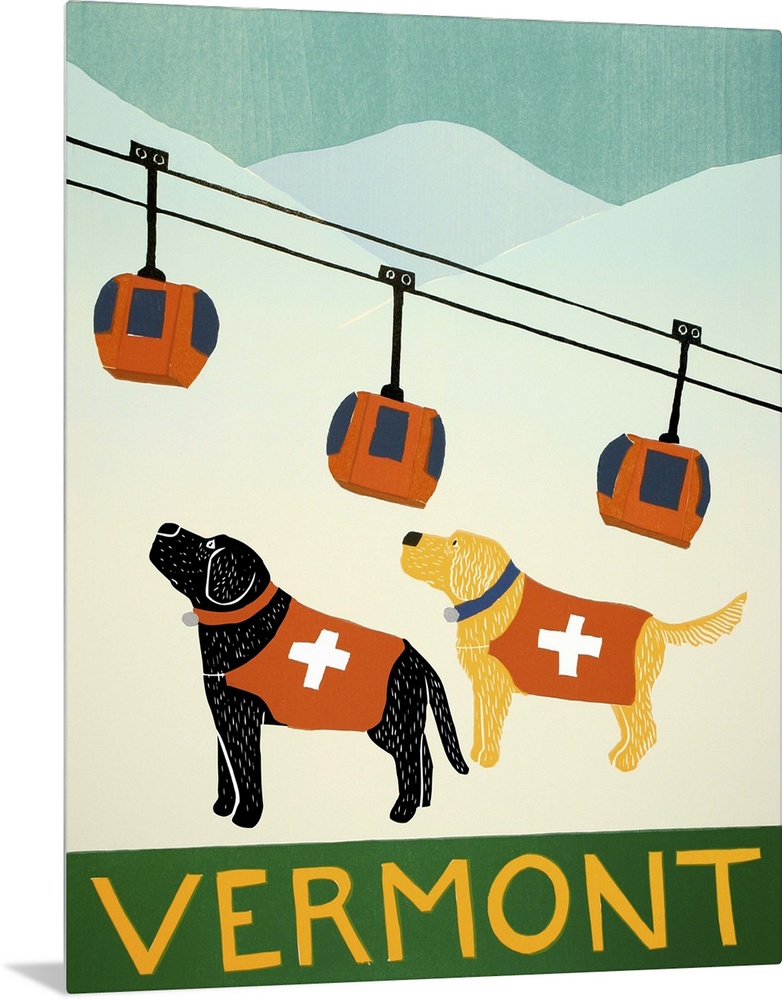 <p>Illustration of a black and yellow lab dressed as ski patrol looking up the slopes with a ski lift in the background and "Vermont" written at the bottom.</p>