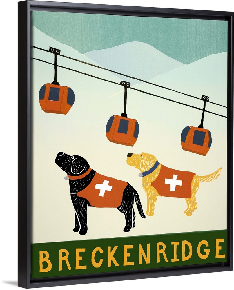 <p>Illustration of a black and yellow lab dressed as ski patrol looking up the slopes with a ski lift in the background and "Breckenridge" written at the bottom.</p>