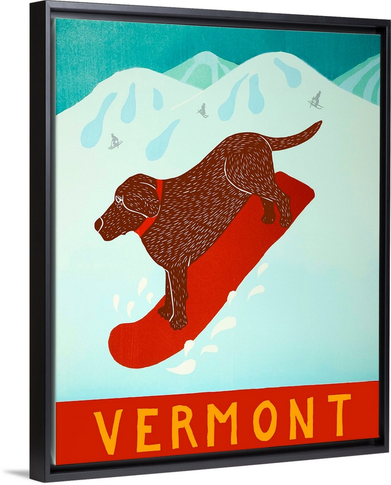 <p>Illustration of a chocolate lab going down the slopes in Vermont on a red snowboard.</p>