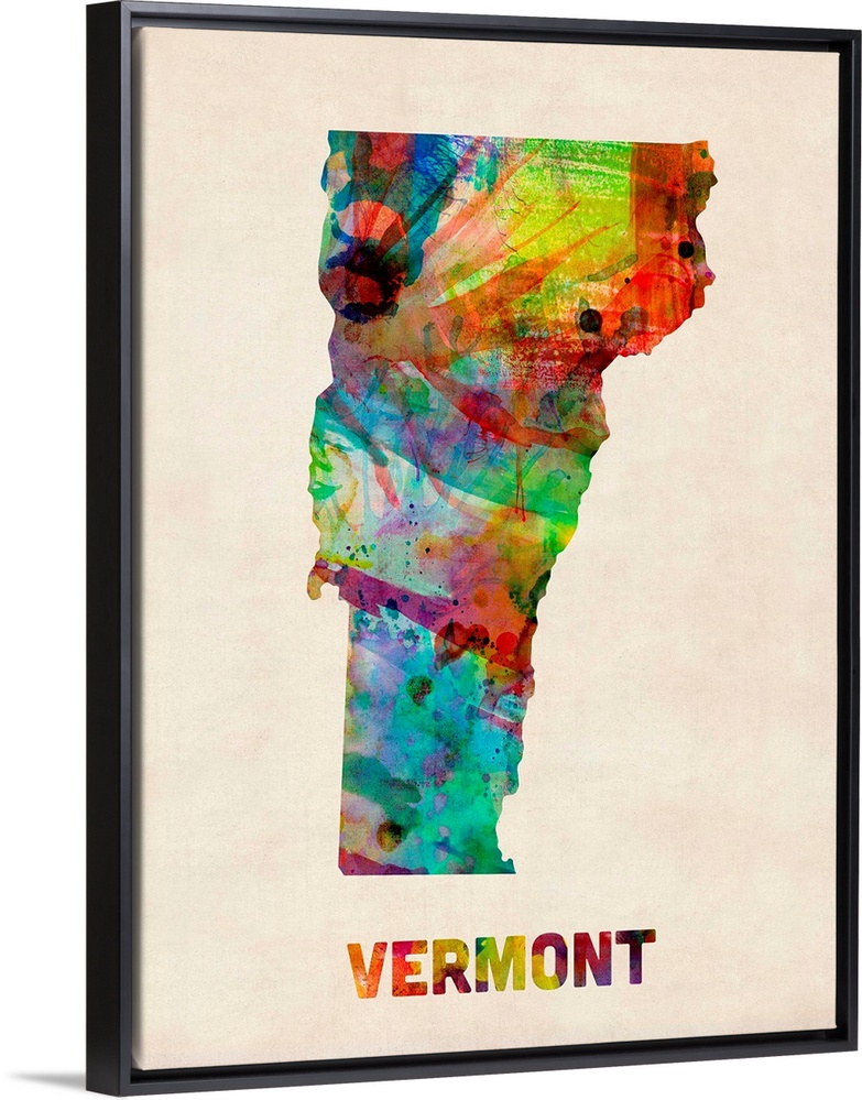 <p>Contemporary piece of artwork of a map of Vermont made up of watercolor splashes.</p>