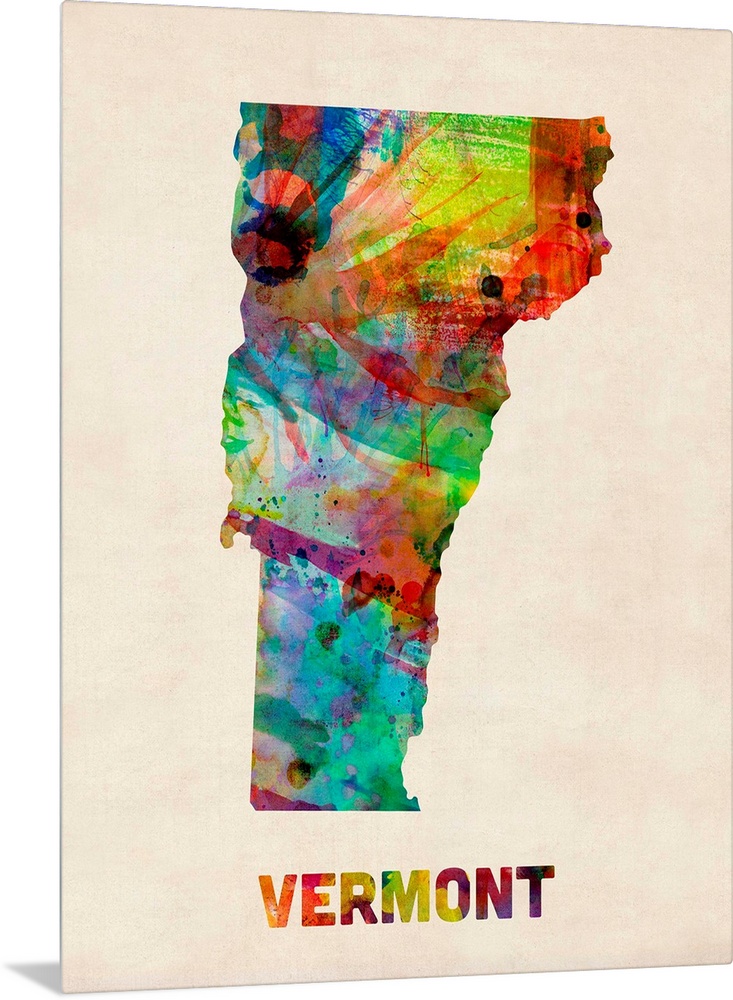 <p>Contemporary piece of artwork of a map of Vermont made up of watercolor splashes.</p>