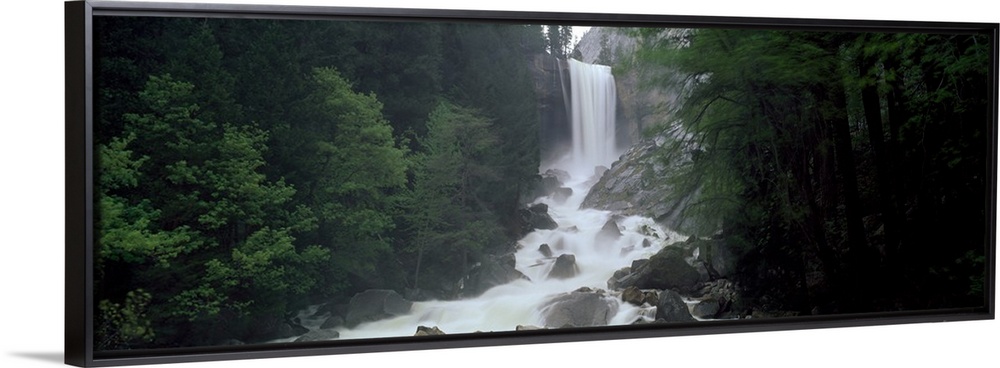<p>Panoramic photograph of waterfall flowing into a rocky stream lined with thick dense forest.</p>