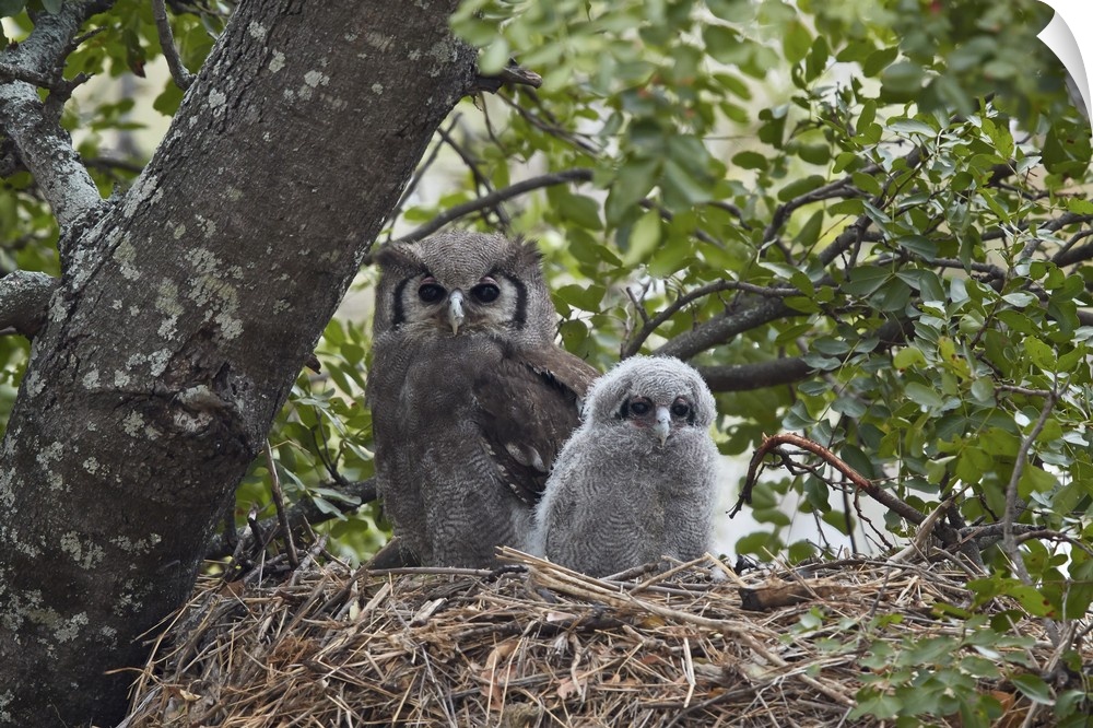 <p>Verreaux's eagle owl adult and chick on their nest, Kruger National Park</p>