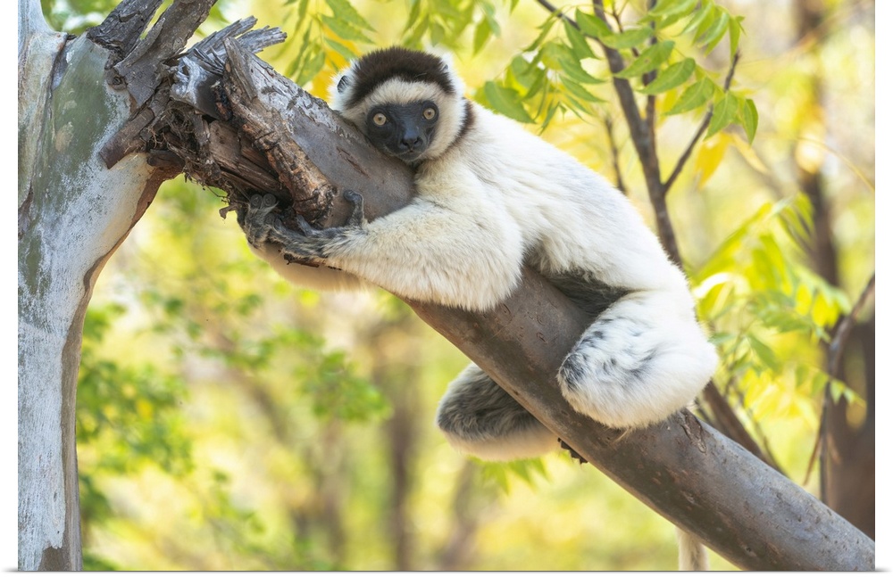 <p>Africa, Madagascar, Anosy, Berenty Reserve. A Verreaux's sifaka hugging a tree because it is cooler than the outside temperature.</p>