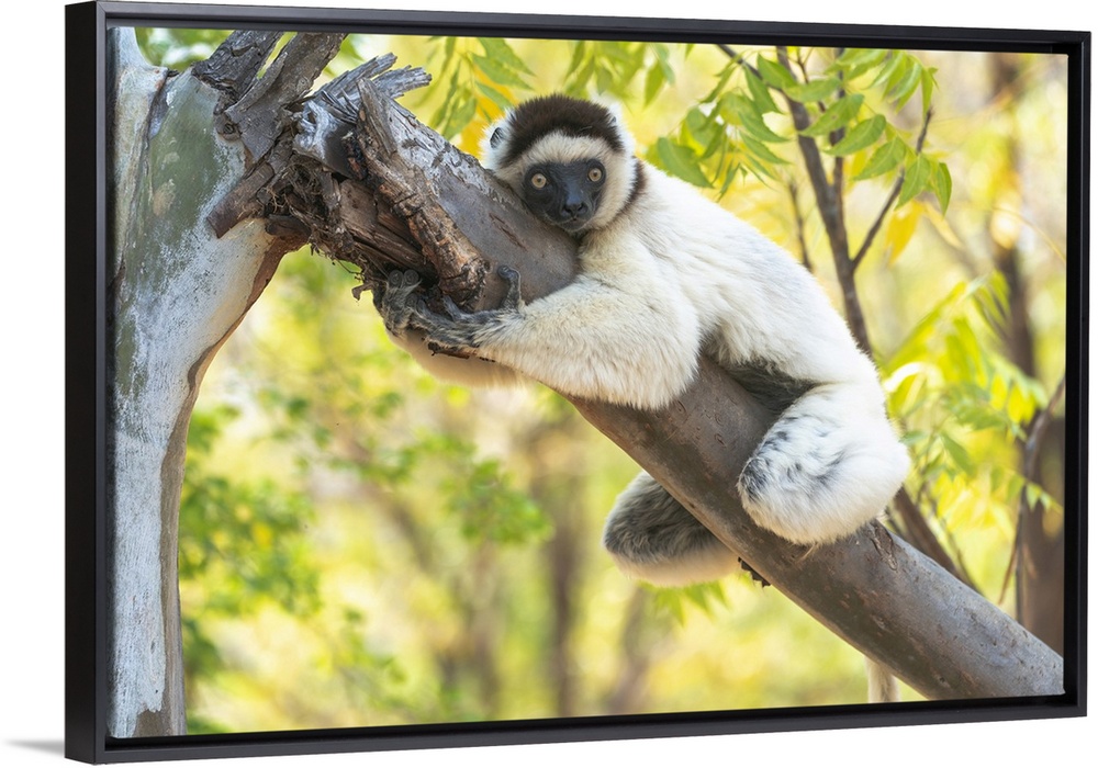 <p>Africa, Madagascar, Anosy, Berenty Reserve. A Verreaux's sifaka hugging a tree because it is cooler than the outside temperature.</p>