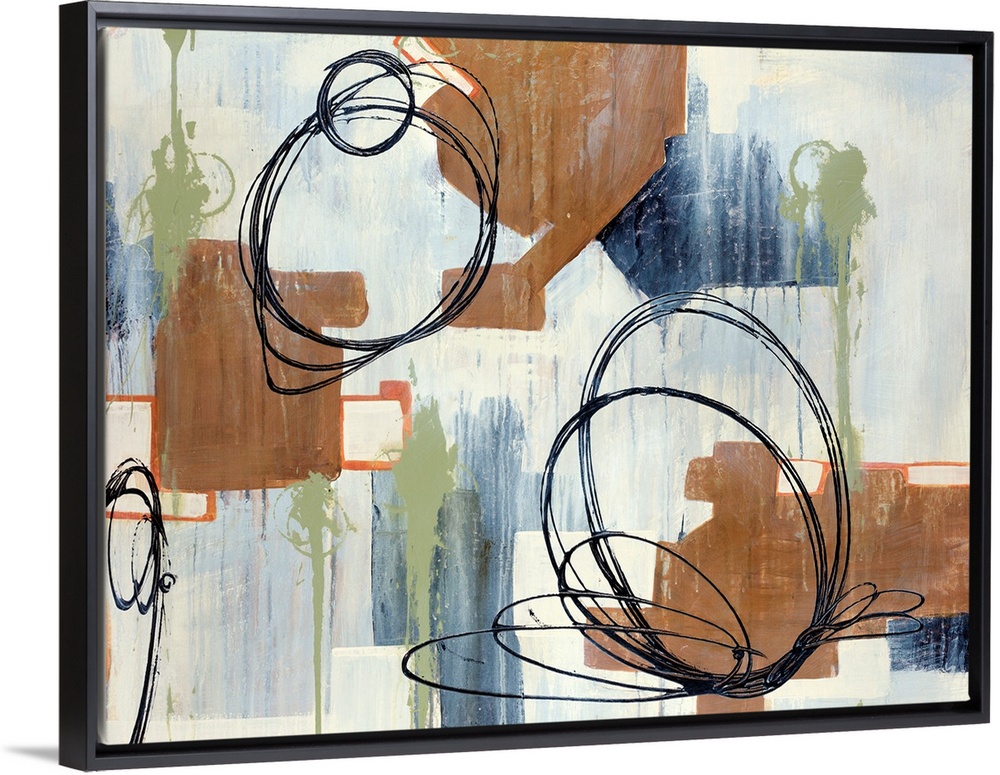 <p>Abstract painting of circles and various other shapes on canvas.</p>