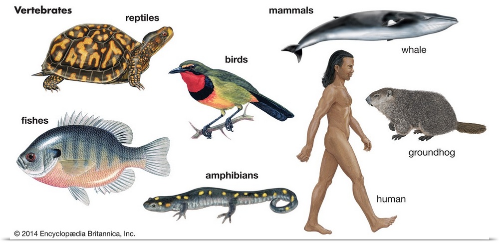<p>An educational poster from Encyclopaedia Britannica showing the different types of vertebrates, animals with spines.</p>