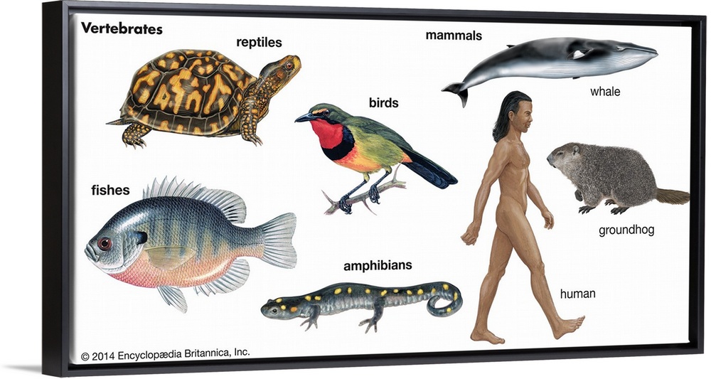 <p>An educational poster from Encyclopaedia Britannica showing the different types of vertebrates, animals with spines.</p>