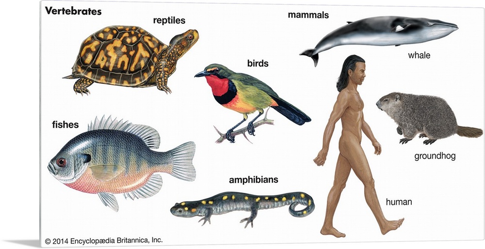 <p>An educational poster from Encyclopaedia Britannica showing the different types of vertebrates, animals with spines.</p>