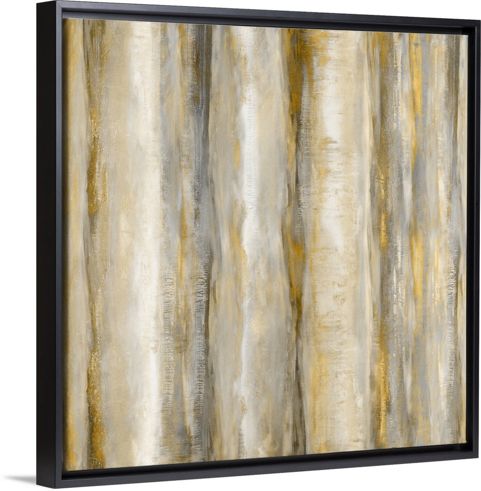 <p>Square abstract painting with bands of metallic gold and silver running vertically across the canvas, and neutral tones in-between.</p>