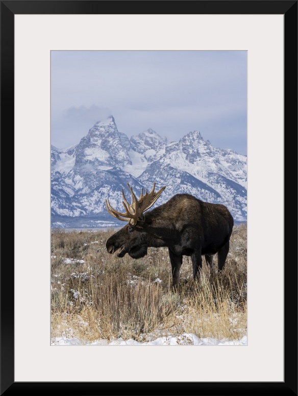 <p>Vertical of bull moose (Alces alces), in front Grand Teton peak, Grand Teton National Park, Wyoming, United States of America, North America</p>